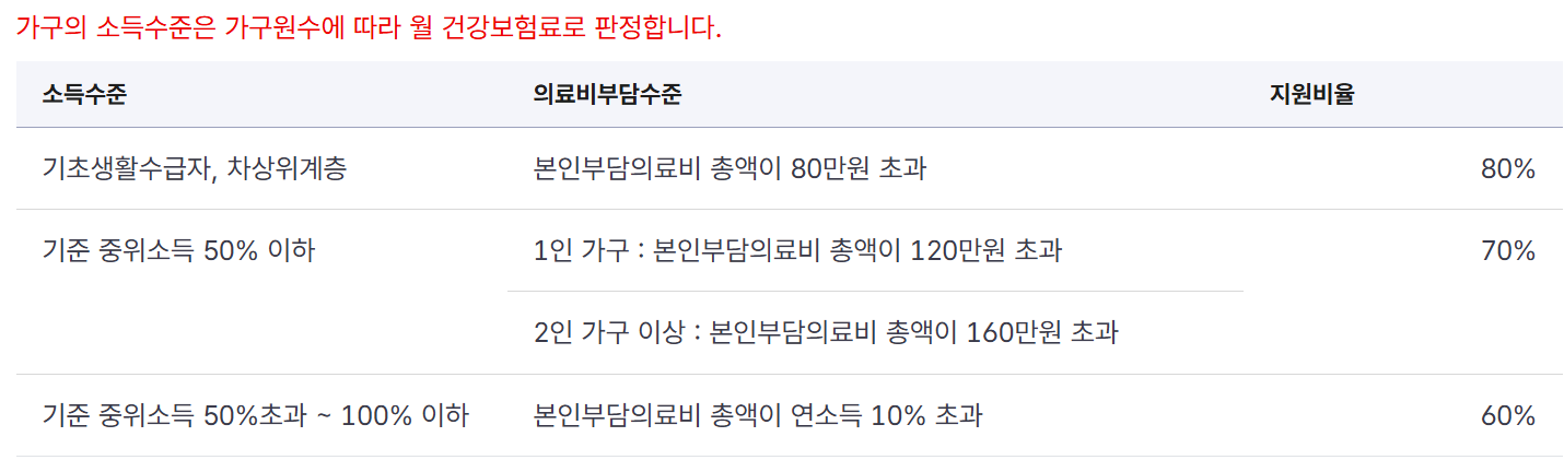 - 의료비부담수준 : 가구의 소득 구간별로 본인이 부담한 의료비 총액이 기준금액 초과 시 지원